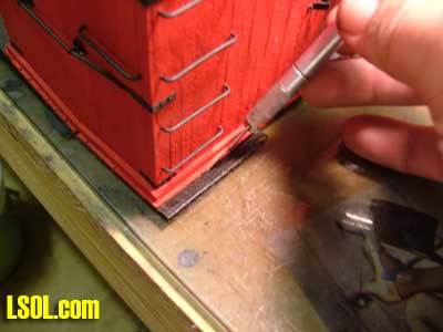 After the glue dried on each piece I trimmed the tar paper flush with the edged of the roof.