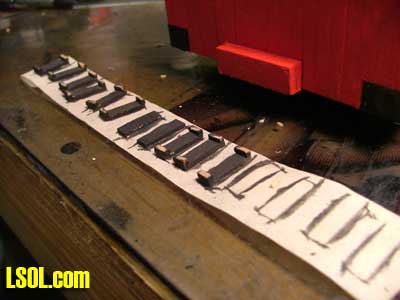 For the roof walks I used the same sized boards as the sheathing (but longer). First I made supports for the roof walk by cutting the strip wood the width of 3 boards plus a little for a gap between the boards. Then on the end of these supports I glued some 1/16th square balsa wood I had left over from my model airplane days. For the new cars I painted these supports black.