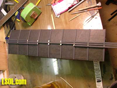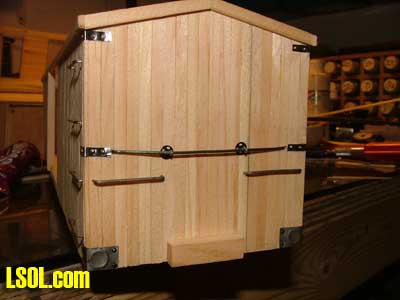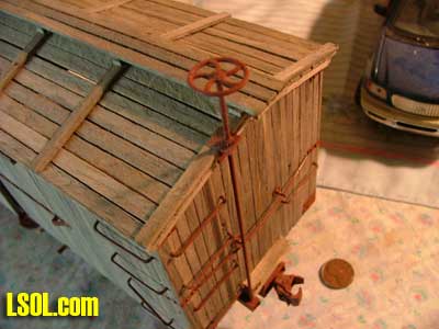 Up till now I had made all the metal parts with steel because I wanted to rust them, I thought real rust would be cool. But the articles I have read must have been wrong because vinegar doesn't rust steel very quickly. So after wasting several nights trying to get the steel to rust I gave up on it. I ended up painting the metal parts with a rust colored paint. Bob Gentile told me about an acid that would do the trick, but the parts were already mounted to the cars, and I didn't want to end up dissolving the cars to get rust.