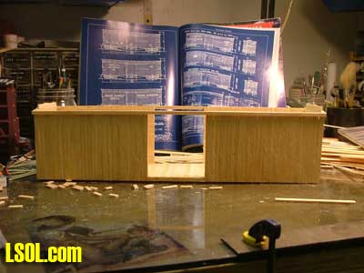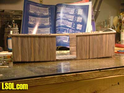 Then I built up the sides of the bolsters, I used 1/8th x 5/8th wood cut with an angle on both ends so as to be flush with the block and meet the side frame of the car even with the floor.
