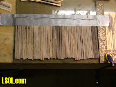 I made some 1/2 by 1/16 boards, then trimmed them to the curve of the floor. On the sagged cars the inside boards were stained on the side that was to be glued to the outside boards, this way the viewer shouldn't see new wood between the outside sheathing boards. When the insides were done on the sagged cars the inside also got a wash of the stain.