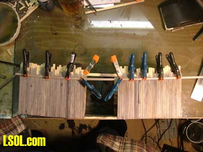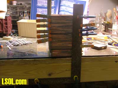 Next I installed the end blocks. Again on the sagged cars they got wire wheeled and stained, then glued and clamped into place.