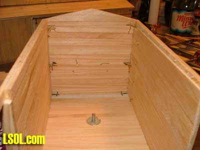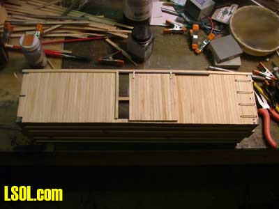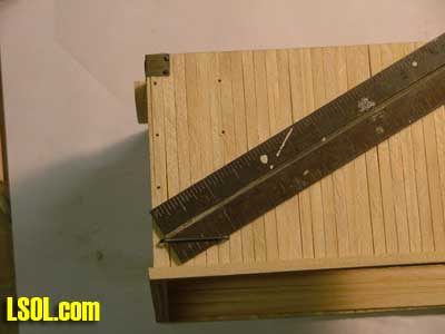 On all the cars after doing the outside I did the inside of the walls. I did the inside of the ends first, then the sides; this creates a stair-stepped joint that should be stronger then a flat joint. The inside boards are 1/16 x 1/4 laid horizontally, but on the sagged cars again I had to solve another challenge, the floor isn't straight, so the bottom board would not run along the floor.