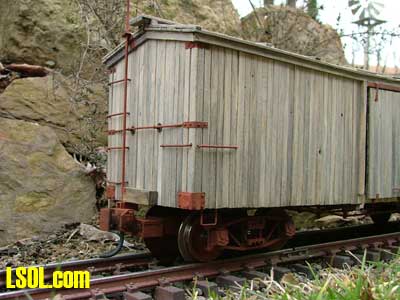 On the display cars I used some left over Bachmann trucks with plastic wheels and some gauge 1 body mount Kadee couplers with the uncoupling pins cut off. For the running cars I used Delton trucks with G gauge Kadee truck mounted couplers and metal wheels.