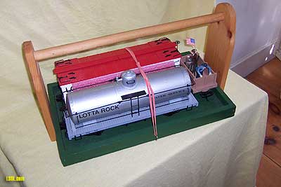 Essentially we are looking at constructing trays that will carry whatever sized engines or rolling stock you plan to carry to the tracks. The trays have two basic parts, the tray itself, and the handle with which to carry the tray with its 'cargo.' Using 1/2" plywood, cut a piece 31" x 14".  Next cut the sides of the tray    2 pieces 31" long and 2 pieces 14" long x 1 ?" wide x ?"thick. These will become the frame for the tray. Cut the corners at 45 degrees and after placing a healthy drop of Gorilla Glue in the joint, fasten it and make a frame.  Now drill and countersink holes in the plywood to which you will attach the frame.  Using 1 5/8" galvanized screws, attach the plywood to the frame from the underside of the tray. Set the screws into the plywood so they do not protrude. You should drill holes through the plywood into the frame before attaching with screws, to prevent splitting the frame material.  Now that the tray is complete, let's turn our attention to the handle. Cut two pieces of wood 12" long x 4" wide x 3/4" thick. Place a 4" diameter can on the top of each piece to outline the top for rounding.  Cut a 1" diameter hole centered 2 1/2" from the top of the rounded end of the handle upright. This will accept a 1" hardwood dowel cut to size after we have the upright attached to the tray. Drill and countersink 4 holes per upright (7/64" drill is a good size). One is placed through the top to attach the dowel/handle and three on the lower section of the upright (one centered 1" from the bottom and the others 1/4" from each bottom edge and 3/4" from each side edge) in order to attach it to the tray.  Be careful drilling into the plywood to avoid splitting it out. Use 1 5/8" galvanized screw to secure the handle holder to the plywood bottom, a 1 1/4" screw to secure the handle holder into the end side of the tray and a 1 ?" screw to secure the dowel handle in the handle holder.  Cut dowel to size (32 1/2"), insert in the handle holders, and secure with the 1 1/2"screw . You might want to consider constructing a second, smaller tray at this point. Cut the 1/2" plywood piece 21" long x 14" wide. Next cut two pieces 21" long x 1 3/4" x 3/4" and two pieces 14" long x 1 3/4" x 3/4". These four pieces will become the sides of the smaller tray. Cut, drill and attach the handle holders just as you did for the larger tray. The dowel will be 22 1/2" long for the smaller tray. Now you're ready for some finish. I used dark green latex paint for the trays. Two coats will keep the trays looking fresh and provide some weather protection. For the handle I used liberal amounts of Clear Wood Finish (CWF) (  In order to secure the engines and/or rolling stock in the tray I used 2 cup hooks on each side of the large tray placed 7" from each end  and large rubber bands attached to one another.  (I used 1 hook centered per side on the smaller tray. Hook one end of the rubber bands on a cup hook, over the engine or car you are securing and hook the other end over the cup hook on the other side of the tray. (  You may know your local postmaster and be able to get some of those large red rubber bands. If not the local Staples or Office Depot should have a supply. The cup hooks are available in any WalMart, Home Depot or Lowes and of course you can pick up the 1" wooden dowels and any other screws, paint or wood you might need while you're there.  I hope your trays will serve you as well as mine have in safely carrying your engines and rolling stock to the next layout where you can have fun running trains, and answering questions about where you got your train trays.
