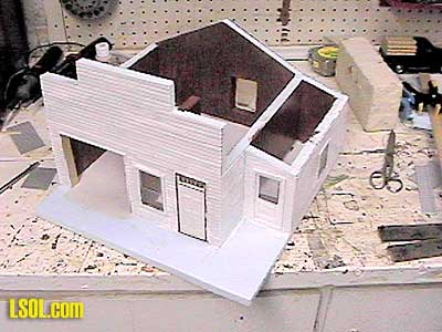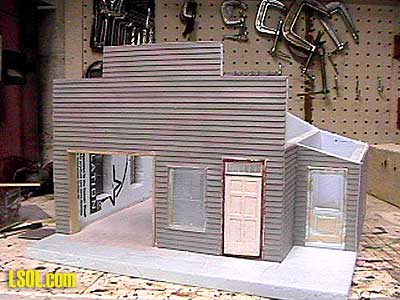 Encouraged by this initial success I decided to try a few more complicated projects. John A. Mower's Garage My original version of this building had been made out of plywood and dollhouse siding about 5 or 6 years ago. The siding and roof had gotten pretty bad and the opening garage bay doors had gotten warped. This building I designed using a general representation of old garages I had either seen in my travels or in photos. I called it John A. Mower's garage in honor of my grandfather who was an automobile mechanic for 35 years. This building has a peaked roof with a small addition on one side, and a front fa?ade squaring out the visible roofline. I made the building with operating swing doors into the work bay so I could add some interior details and I lighted the building so the details could be viewed at night. I use a drafting program to make scale drawings of my buildings before I start them so I have idea how they will look before I put them together to see if the proportions look right. Plastic foam board is pretty easy to work with, you can either cut the foam with a sharp utility knife and a straight edge, or you can cut it on a table saw. The blue foam board I use has a thin plastic vapor barrier on both sides, which I pealed off before assembly. The windows can be easily cut out with a knife and you can test mockup the building using finish nails to hold it together (just press them in with your fingers. I used liquid nails for outdoor projects in a caulking gun to put my building together and to glue on the siding material. You cannot use quick-grab with foam board, as it will dissolve it. I found it worked best to lay out zigzags of glue with the caulking gun then spread out the glue with a piece of scrap wood or plastic. Next put down the siding material, I used lap siding but you could use brick, board and batten or whatever you like. If you are using Precision Products windows or doors you will want to cut the openings in the foam and the siding before glue it down