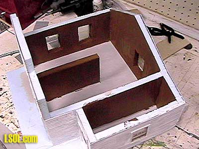 I also cut a doorway into the side addition to allow light from the interior light I planned to install in the main building shine into the addition as well. I painted the interior brown, gave the exterior walls a primer coat of white, and painted the floor light gray to represent concrete