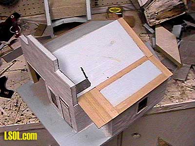 and installed 3/8" x 3/8" cedar supports to the front section. I used tissue paper laid into wet black acrylic paint, with additional paint slopped on top to simulate a tar roof. I've also used strips of super fine grit wet/dry sandpaper with paint on it to simulate tarpaper with good success, or you could use any of the number of precision products roofing materials available. I painted "gas" in white paint on the roof. Finally after painting I added vinyl lettering