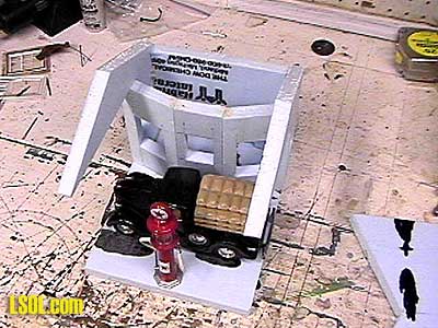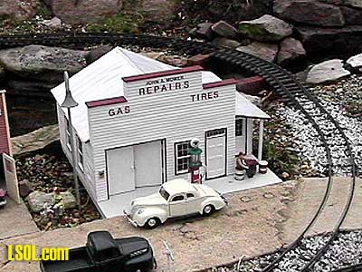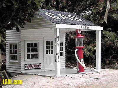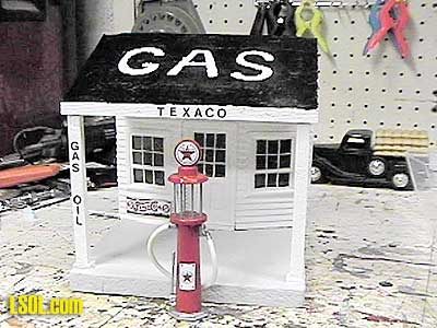 shows the completed building in its installed location. One final consideration when making foam board buildings is weight. Unless the structure is very large or sheathed with wood strips, it will be very light compared to its surface area. This could be a major problem if your layout is unprotected from the wind. My layout is protected on three sides so I have never had a problem, however, depending on your situation you may want to devise a means to pour a concrete floor or interior weight out of cement to give the building more weight or come up with a way to pin the building down to the ground. Texaco Gas Station My Texaco gas station was built using the same principles outlined above for the garage. I started with a shell of foam