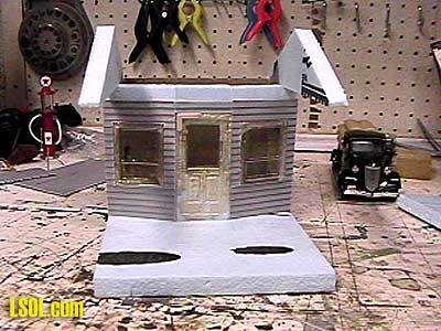 If you are using plastic windows with a flange like Grandt Line, you could actually wait to cut out the doors and windows until after you have glued the siding down if you want to. The key thing to keep in mind is to either clamp down the siding to the foam or use weights (like bricks) to hold down the siding until the glue dries (a day or two is best) if you don't do this the plastic sheeting will warp, especially if it is a large piece. I decided to add a base out of foam that extended beyond the walls in the front to give the structure a place to add some additional details and a gas pump. The assembled walls are shown in