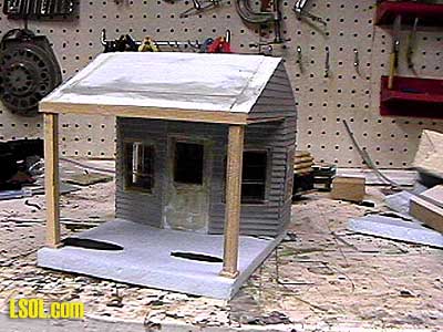 I use acrylic paint for all my garden railroad building painting and have found it to work very well. Since this building was going to have a large open door in the front I decided to reinstall the interior details I salvaged from my original garage. The details consisted of a couple of wooden workbenches and a bunch of leftover model car parts and tires including two engines. I also added an interior light on the upper part of the front wall below the roofline to illuminate the interior of the building. The next step was to cut out and glue down the roof to the walls. If you have a table saw it makes a pretty easy job of it if you can cut the ends at the angles needed to match the peak angles. I glued in the roof pieces so that they were 1/8" higher than tops of the walls. I then took some cedar strips approximately 7/8" wide and 1/8" thick and after cutting them to length I glued them to the tops of the walls. This way they were flush with the top of the roof pieces and gave me an overhang of approximately 3/8" past the walls. I also glued several pieces together to make the little porch in front of the addition on the side of the main building (see