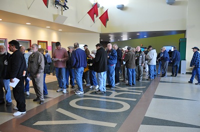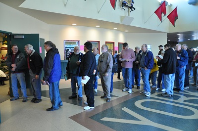 Friday morning dawned clear and cold with a temperature of about 24 and the wind blowing 20 MPH. That didn't stop the Large Scale train lovers from flocking to the hall and lining up to be the first to enter.