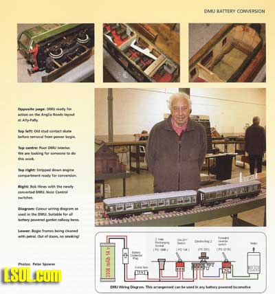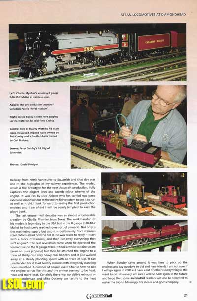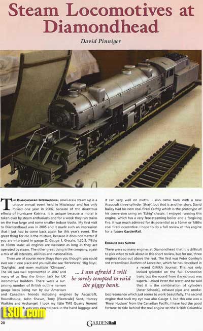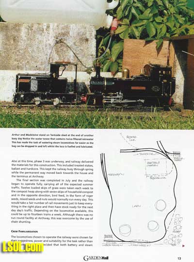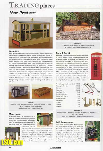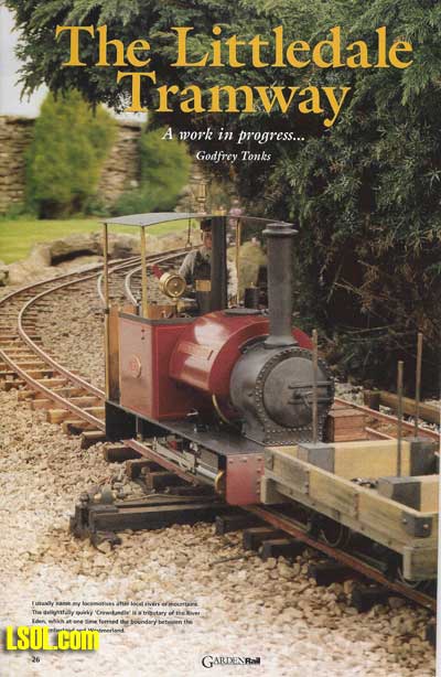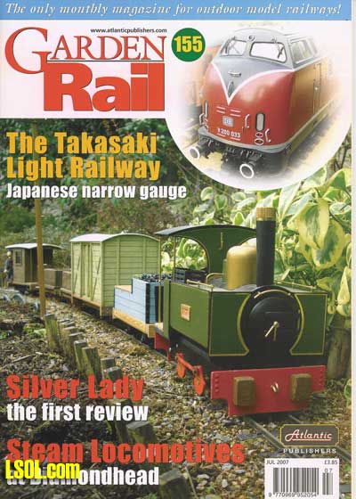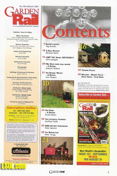The other day I noticed that another garden-railroading magazine was going to be appearing in hobby shops in the near future. Carsten's Publishing, which publishes "Railroad Model Craftsman", "Railfan & Railroad" and "On30 Annual", advertised that they will be offering three new magazines in hobby shops and one of them is "Garden Rail". I was interested in discovering something about that magazine so I contacted the editor and asked for a couple of issues to allow me to write a review for LSOL.com. He quickly complied with my request and even offered to send a sample of the books on Garden Railroading that they publish. The magazine is "Garden Rail" published by Atlantic Publishers located in Southend-on-sea, Essex, United Kingdom. www.atlanticpublishers.com In addition to "Garden Rail", Atlantic publishes several other magazines and books dedicated to the railway hobby industry.   The magazine is a British publication aimed at established "converts" to the hobby, as well as those yet to desert their indoor layouts and discover the real potential of large-scale modelling in an outdoor setting. It is a very professional looking magazine with lots of high quality photos and a clean layout. Tag Gorton is editor of "GardenRail" magazine and a past editor of "16mm Today" (The house organ of the Association of 16mm Narrow Gauge Modellers), author of Steam in Your Garden (an introduction to commercial narrow gauge steam) and editor of "Garden Railways in Focus". He also produced a monthly column for "Model Railway Enthusiast" and was, for many years, the garden railway correspondent for "Railway Modeller". Tag was drawn into the garden by the siren call of live steam and, while his own railway is to 16mm scale, he has an interest in all live steam motive power from twelve inches to the foot down. He grew up in the county of Surrey and, while he always had an interest in railways, his career in the Royal Navy precluded him from doing much in the way of modeling - although he did dabble in N gauge for a while. He started modeling in the garden on leaving the Royal Navy and after seeing the early live steam narrow gauge locomotives produced by Merlin and Archangel. He was fascinated then by live steam and remains so today. Tag writes the editorial page each month that talks to his experience with his own railroad and provides bits of information about his railroad's impact on his domestic life, the weather, difficulties with purchasing US products in the UK, upcoming garden railway shows and the Garden Rail website that is currently being improved. He says "I took up writing after becoming bored with my civilian occupation and things sort of developed from there".  The cover features a main photo of a garden railroad layout featured in the issue with a right top insert photo of a product being reviewed that month. The table of contents page includes a listing of the staff and the contents of that issue. . There are also miniature photos providing previews for some of the articles. The contributing staff is fairly extensive and includes review columnists, technical experts, a horticulturalist, photographer and administrative personnel. Tag points out that the only full time staff includes himself and a graphics and advertising person.  The magazine covers a couple of garden railroad layouts each month, with descriptions of the railroad, bits of information about the locos, rolling stock and/or buildings made by the owner, a diagram of the railroad layout, plant information and usually a little history about the owner and the railroad. The August 2007 issue covers "A Real Railway" about the Dovenby Beck Light Railway. "A Real Railway" is written by the owner and the railroad is used by the author to move vegetables from his garden, bird feed, grass cuttings, coal for the locomotives and even ballast for the railway. I found it very interesting that the steam locomotives and many of the diesels are all named. The author writes about his live-steam locomotives Arthur and Madeleine as if they were people.   The second layout covered in the August issue is "The Littledale Tramway, A Work in Progress" by Godfrey Tonks. It is an imaginary line used to serve the lead mines in the North Pennines area in England. Here again the locomotives are named Mortimer and Crowdundle and the ties are called sleepers. It is a beautiful little railroad with many people figures and small well-done buildings. Mortimer is a live steam loco and Crowdundle is a small electric scratchbuilt switcher. These locos pull very small coaches and wagons on the railway.   The product reviews are generally on European models, but they have done several reviews on American models, particularly with G scale electric models. In the August 2007 issue, there are reviews on the LGB V51 Diesel, the P&J Models Drop Door Coal Wagon, the Regner Dampf & Eisenbahntechnik Wilma and the Bachmann Ore Car. As you would expect, these reviews are from the British Narrow Gauge perspective and contain subtle dry British humor, but they are fair and accurate reviews.     There are "how to" articles in the August issue. The first is by Peter Spoerer about how to convert a stud contact DMU (Diesel Multiple Unit) to modern battery power. The Gauge One model in 1/32 scale is a 1957 version that had been lying around in a cardboard box for several years. As near as I can tell, a "stud contact" loco is one with a skate contact for a center third rail and in order for the loco to run on one of the modern club layouts, it needed to be converted so that it could obtain power for the motor. The article is an excellent series of steps required to make the conversion to battery power. The photos are very clear and make the article easy to follow. The suppliers of all of the needed parts are named and the addresses are included. The author was able to complete the conversion in time for the Ally-Pally (Alexandra Palace) 2007 train show. It appears that the exterior of t