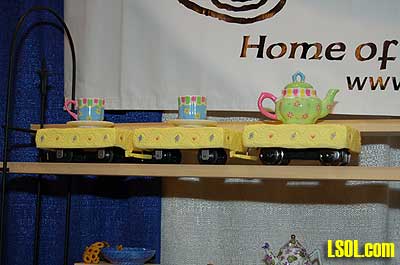 A big seller for them are trains made as teacup sets. In these sets, there is a motor in the teapot and the cups are the cars.