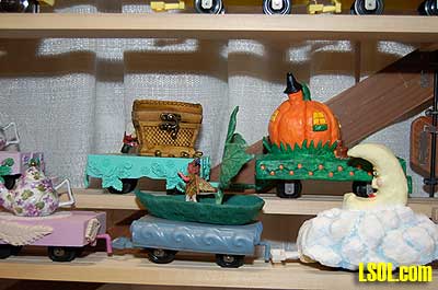 They also found that there are many people who create whimsical gardens that have nothing to do with Garden Railroading as many of us think of them. Their Fairy Trains appeal to those people in a way that traditional Large Scale trains do not. These gardeners use small buildings, fairies, dollhouse furniture, whimsical figures and miniature flowers to add interest to their gardens. Ray and Ellen saw a strong interest in this type of garden and thought it might provide a market for expansion in the Garden Railway community.