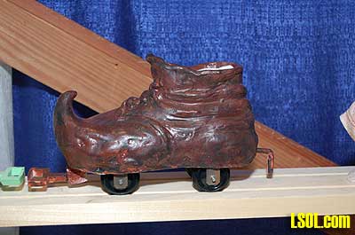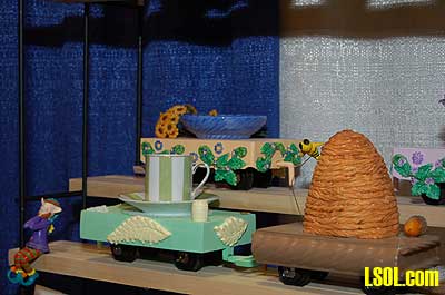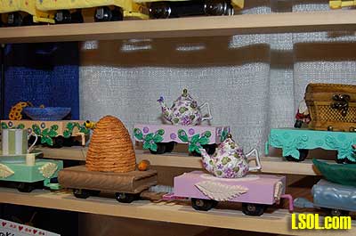 This led them to create the Fairy Trains that they sell. The engines and cars are individually made and consist of teacups, old shoes, beehives, eggs, fairies and other whimsical objects. Ray explains that these trains tend to appeal to the women and children, especially girls, whose husbands, fathers, grandfathers or significant others are interested in Large Scale trains. These trains get the women and girls started in the hobby.