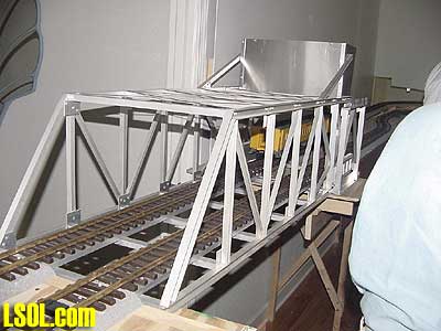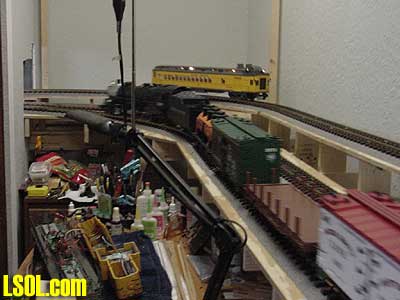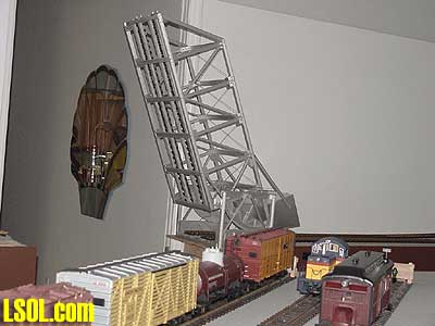 Harry uses the closet space not taken up with track for his workbench. I have made suggestions about extending my line through other parts of our home, so my wife was not encouraged to actually see Harry's portals through the walls. The most arresting feature of the railroad is a rolling lift bridge designed and built by Dana Barlow. Harry uses the bridge to allow visitors entrance into the railroad room. Beautifully executed, it is the last bridge built by Dana. The bridge is electrically powered and can be raised or lowed by pushing a button under the bench work.
