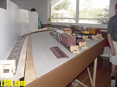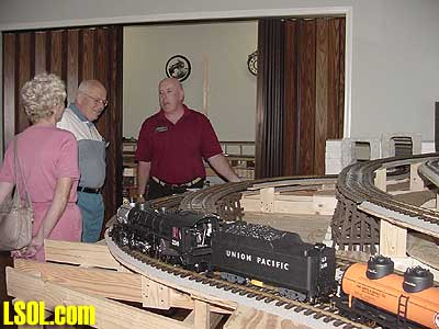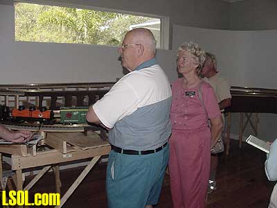 The quilt is shown in the picture, with Elaine and Wayne on the right and Cliff and his wife, Wynona on the right. During the day, Ann and I and the members mixed freely, enjoying talking about trains, jobs, grandchildren and where we were all from originally. Most of the members are transplants from the cold north, who have migrated to Florida in retirement. Enthusiasm was high about large-scale trains. We were invited to see some additional railroads in the area and this week we will journey to Ft. Pierce with Harry to see Fred Boldt's and Jared Petersen' large-scale railroads. Top of Page