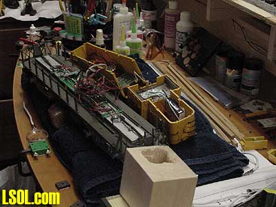 He also has a USA Trains GP-9 torn apart installing an on-board receiver. He plans to convert all of the engines to battery power. Harry took us out in the back yard and explained where he will construct an outdoor railroad along the back of his property when he has the time and money.