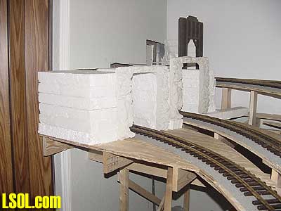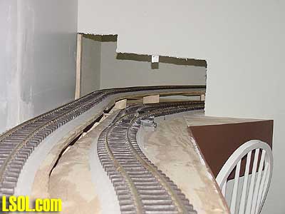 The engine servicing area will include a Pola coaling tower, Kamloops Station water tower and a sand house and yard building which Harry purchased from J & M Models. He will soon have a coalmine from Garden Texture. He plans an engine house built from plans purchased from Brewer Plans and scale lumber from Garden Texture. Harry put tunnel portals in the walls to allow the track to run into what was once a closet.