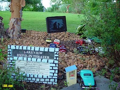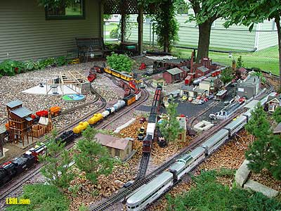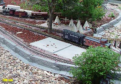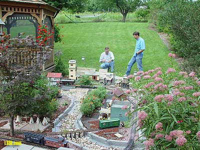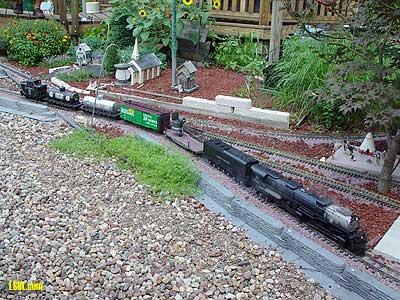 rushing past windblown railroad flags to their destination - the local garden railway, the Lake George and Boulder Division of the BGN&ATSF RR. (Birds, GardeNs, & A Terrified Squirrel Fleeing RR) in Iowa City, Iowa. Trains were up and running - the smell of the coal smoke spewing from their locomotives. The locomotives of the L.G.& B were chugging along the rail beds headed for a grand tour. Sights viewed throughout Lake George, Boulder,