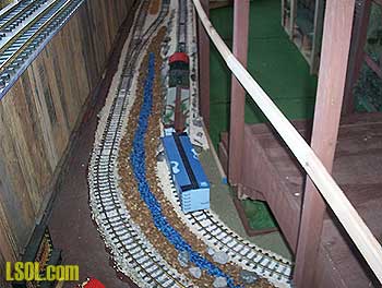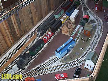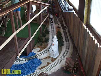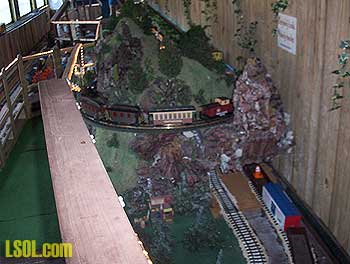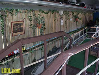 Our layout is not "on a table", instead, it reflects the outdoors from "our" layouts at home by being mostly ground level and extensive landscaping using artificial plants and foot bridges to cross the tracks to give the feeling of the back yard. Wood fencing along the wall, round out the back yard experience. If you listen carefully you may even hear a mosquito humming near your ear. Extensive use of Innovative Train Technology Systems sound cards used around the layout heightens the visit with sound.