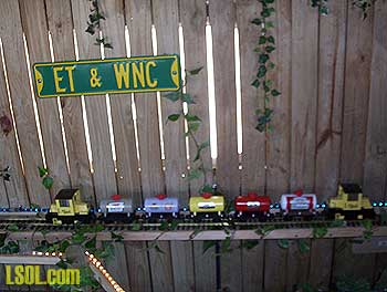 All of our trains run automatically using track switches and magnets or timers. Rolling stock includes engines by Bachmann, Aristo, LGB and Hartland. A special train running custom designed toy scene box cars including Winnie the Pooh, Blue's Clues, Toy Story and others themes and a cow train by LGB moos around each corner. A number of box cars, gondolas, tankers and flat cars have been specially painted and lettered honoring donations made by businesses, groups and members.