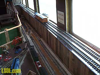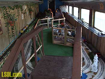At the present time we have 3 point-to-points running with a total of 88 ft. of track. Two of these run side-by-side, but in opposite directions right in front of the window and very visible from the outside. The other point line is on the opposite side of the coach and is entwined with vines growing on the fence. The inner loop has a total of 89 ft. of track that includes three active sidings and a safety block that allows us to run four trains on it. The outer loop has a little over 100 ft. of track including one siding with two trains on it. Both of these loops change elevation and drop to floor level to go into the mountain and to go under the footbridges on each end of the coach.