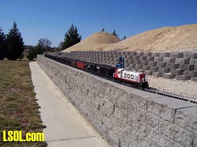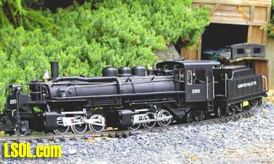 On Sunday March 11, at its monthly meeting, the Shoreline Garden Railroad Club conducted its first annual pulling contest. This was held at Bob and Dianne Johnson's layout where there are twenty-foot turns, and very long straight runs. The pulling consist was made up of two Bachmann Peabody hoppers, and two Aristo 100 ton hoppers, each with a 5 lb diving weight inside. In addition, there were hoppers with 8 pounds of pellet gun shot, or fishing sinkers. Overall there were 18 Aristo 100 ton hoppers, some with loads as described and some without. This was the standard minimum load. To this was added for the Big Boys, 5 Aristo Streamliner passenger cars without ball bearing wheels, and finally a 10 pound ALCO FB unit as dead weight. The total weight values reported are based on the loads plus the weights of the hoppers and other cars pulled. The results were the following: Barbara Moore's little battery powered "Clementine" won in the small and medium steam divisions (pulling an unbelievable 74.3 lbs.). Pictured is the Clementine resting after the hard pull. Brad Moore's "Sumpter Valley" Mallet, with no weight added to the engine (pulled 134.5 lbs) in the large steam division.