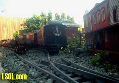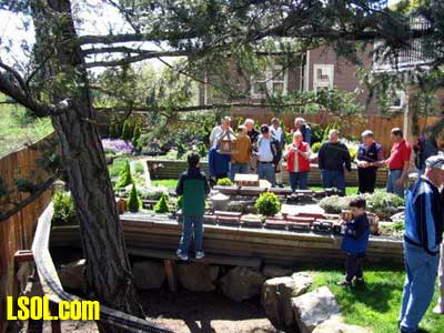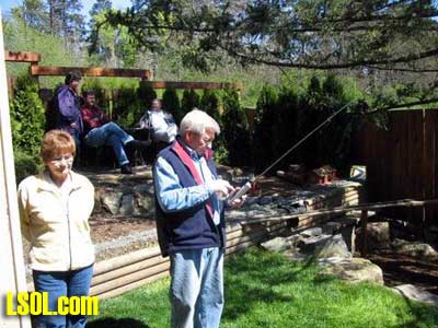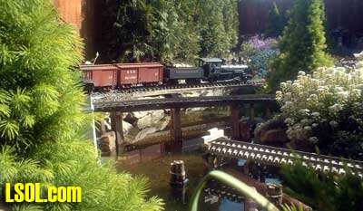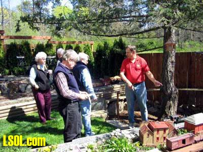As host for the day, I was the dispatcher and taught each new engineer the rules and the RC controls. I am wearing the red shirt in the pictures trying to teach new engineers, track the movement of 4 trains, assign passing sidings, avoid train wrecks at the diamond and socialize. Rules of Operations for the Lone Firr are simple. Passenger has priority over freight which has priority over logging trains and Northbound has priority over Southbound. The only 3 binding rules are the passenger train has to stop for at least 2 minutes at all stations on the platform track, both North and Southbound. Any train on a reversing loop has to hold in the hidden staging for 2 minutes prior to coming back onto the mainline. Every steam engine has to fuel and water once per circuit for 2 minutes. The engines are all radio control (75mhz TE) with Lithium Ion Batteries for power. Most engines also have sound cards/speakers all of which is stuffed into tenders. For the event I purchased a second Transmitter so that we could operate with 2 Engineers, 2 Brakemen and 1 Dispatcher. All turnouts are manual, so the Brakemen were kept busy at all passing sidings. It was, after all, a social event and union rules demand coffee breaks every 15 minutes so we continuously changed Engineers and Brakemen. There were two E&N Mainline trains, one passenger pulled by a 4-4-0 and one freight pulled by a 4-6-0 assigned to the E&N Engineer. There were also two VL&MCo Logging Trains assigned to the VL&MCo Engineer, a 2-6-0 Mogul and a 0-4-0 Tank Engine. The weather started out wet in the morning as the meet was on 22 April, but by the time everyone arrived at 1 PM, the sun was shining and we had a wonderful day in the garden until 4pm. The pictures are courtesy of Paul Roberts who hung on to his camera and stayed away from the controls. ( A safe bet). I like to set all the engines to a maximum momentum, so there were more than a few emergency stops during the day as the running distance between some stations is only long enough to pull out of the yard, get to speed and slow down for the next yards limit. If you started talking to the brakeman, you could guarantee trouble ahead as the yard limit signs came up fast and the braking of a train full of logs took at least 30+ sec to come to a full stop. The challenge of the day was keeping the 4 trains running continuously. New engineers/brakemen were limited to 1 train in motion at first until they had completed an entire loop. Once they felt comfortable, they graduated to 2 trains in motion. For most of the day we had 2 trains in motion with the other 2 holding on passing sidings. At one point, the dispatcher lost control and we ended up with both sidings in Chemainus and Ladysmith with all 4 trains pointing boilers at each other. Fortunately one of the trains at Ladysmith was a VL&MCo Logging train which we backed onto the log dump. This cleared a passing siding and allowed the dispatcher to push the E&N freight through and get things back on schedule with a little highballing. Of course while this was happening every club member present had some comment about the dispatcher?s ability to control things. Later in the day one of the members fired up his Aristocraft live steam Shay and we let it loose on the mainline. The E&N mainline was built with a 0% grade throughout for Live Steam operations so it was great to see it slowly moving across the mainline. With Battery /RC controls, we followed the Shay with other trains with the Engineer paying close attention to the distance to the Shay. Overall a great day was had by the club members and all engineers/brakemen passed with flying colours. For additional information on the club plus pictures of other club member railway?s, please click onto http://www.vigardenrailway.com and enjoy the Vancouver Island Garden Railways