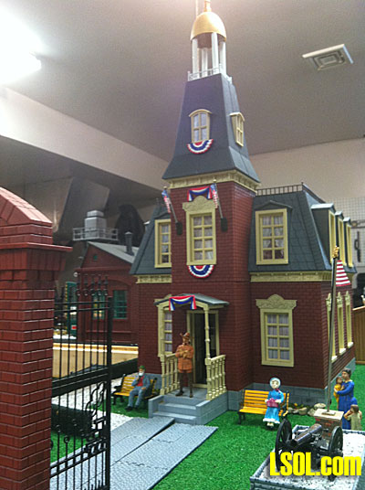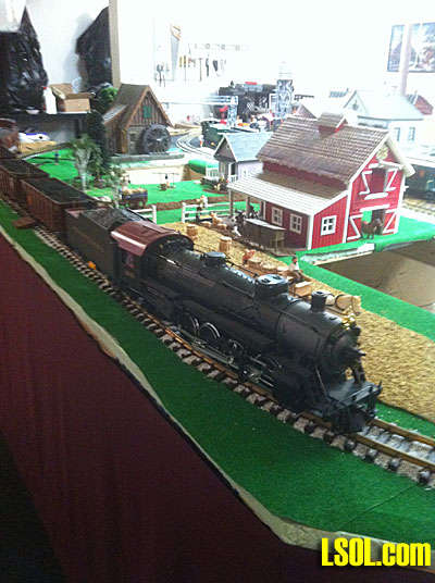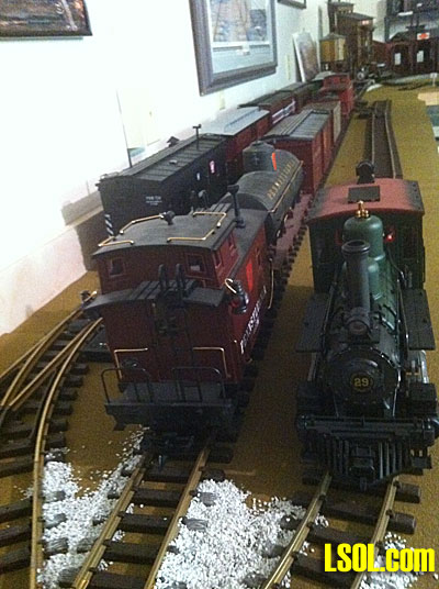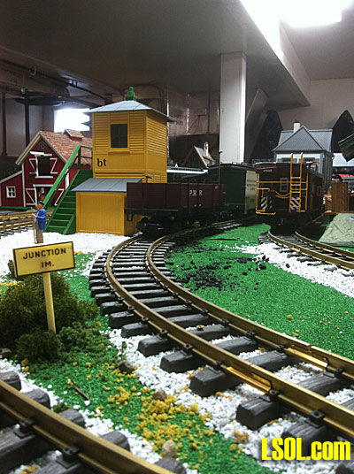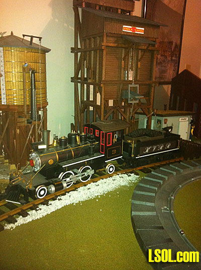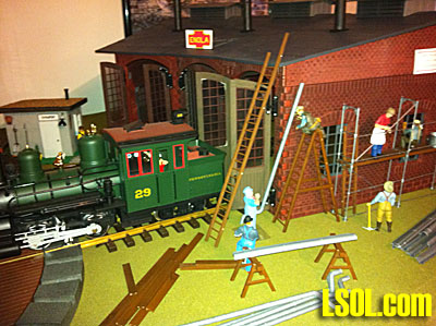 It ends with a turntable and roundhouse, which is still under construction, so that trains can be run in either direction. All of the locomotives are equipped with sound and LGB's multi train system (MTS) operating system.