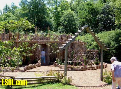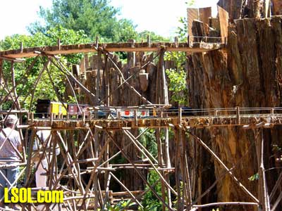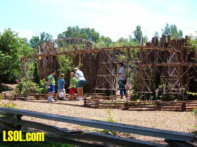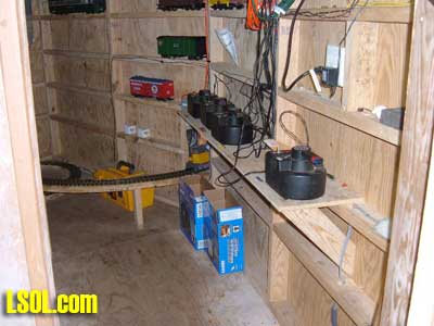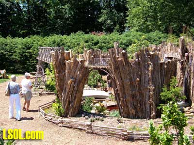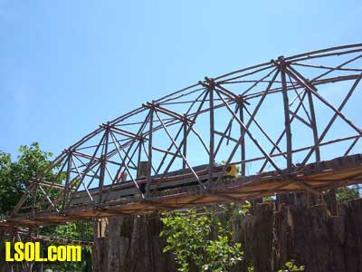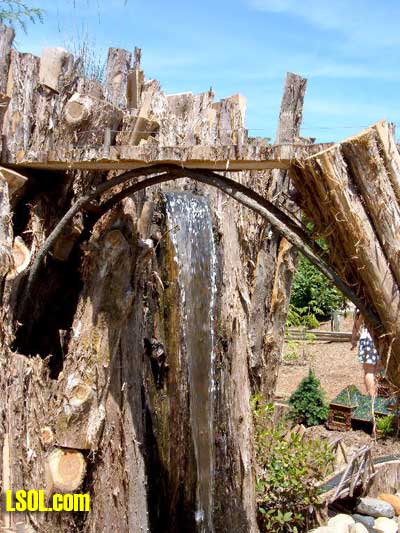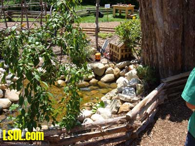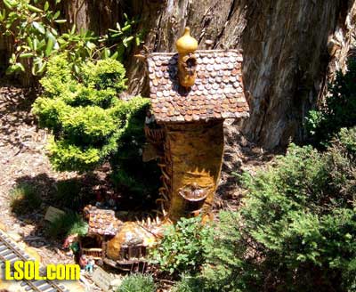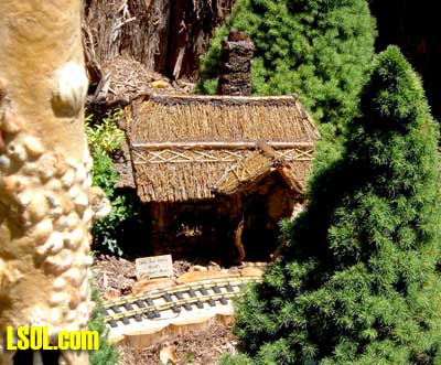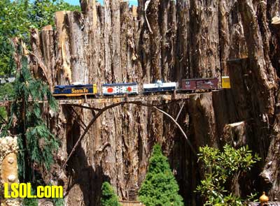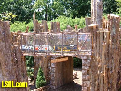 On the ground runs a "Butterfly" Eggliner on a point to point track.  The 1 foot elevation was running a diesel with a short passenger consist.  The mid level was a diesel freight consist and the high level was a streamline diesel and heavyweight coach.   All the trans run at a slow speed that is nice to watch and have good sound as well. The entire railroad has so many things to look at it boggles the mind. All the wood used is cedar that is used for roadbed or covering of the basic structures. The trestle bents are all small trees sticks or what ever was of needed size for construction, and well built as well as really neat looking.  Under the highest level track there are sensors mounted under the framework, so if there are no visitors the trains will stop running. When some one gets close all the systems operate for a while, I don't know what the timing is. I did manage to talk to the day's "volunteer engineer", and he did show me the control room after he spotted my LSOL.com shirt and hat. That area is off limits to the general public. In the 2 rooms under the "mountain" are the operating controls and storage shelves for the trains.  You will notice if you look carefully that the tracks enter these rooms at all 4 levels so the trains can be stored inside at night or when not running. All of the operating controls are in one room in a closed panel. The track work is all sectional track with jumpers soldered over each joiner.