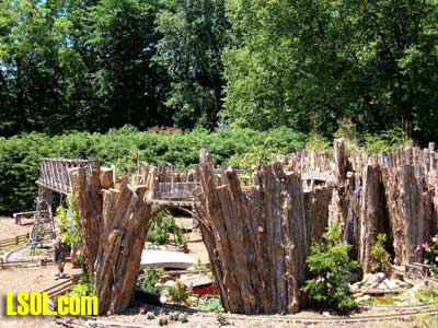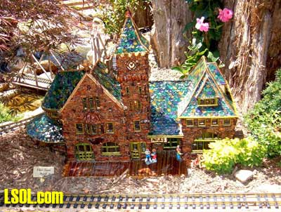 All of the buildings are made of natural materials well sealed against the elements and should last for years along with the railroad. There are all kinds of buildings, some are fantasy, such as Little Red Riding Hood's home.  The Old Woman in the Shoe  and several more. There are replicas of real buildings, the Niles Depot