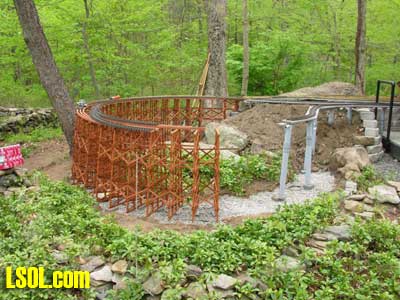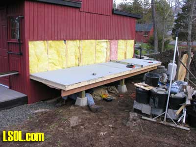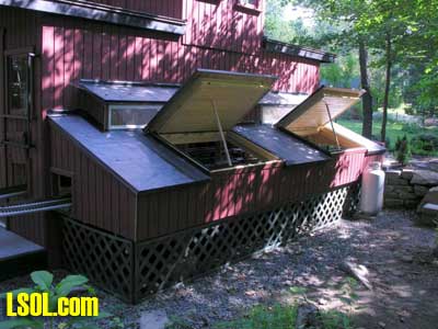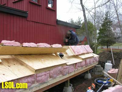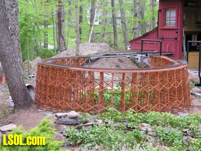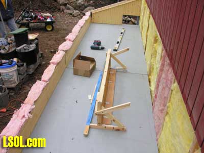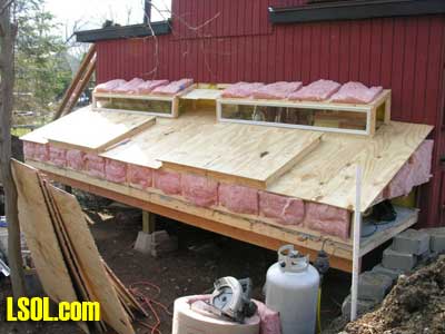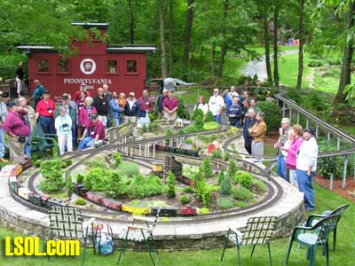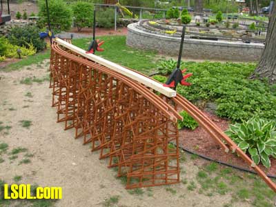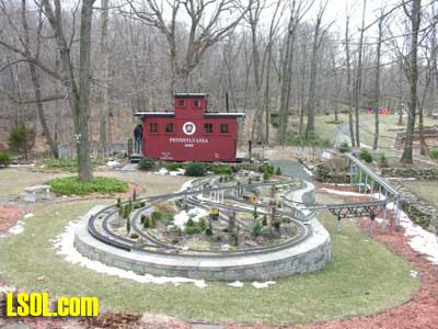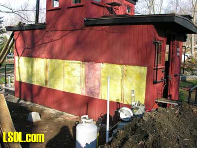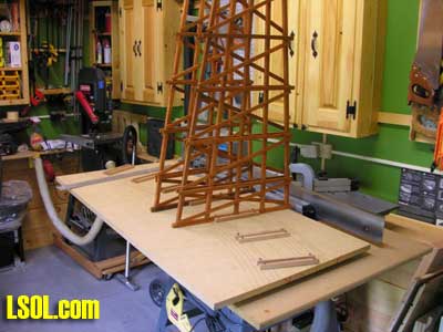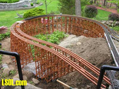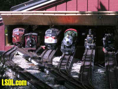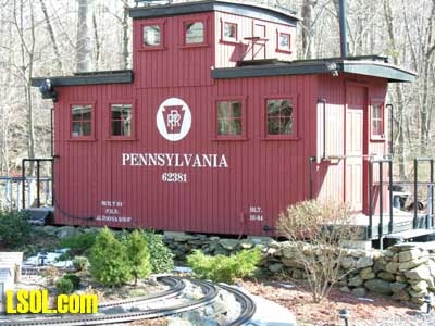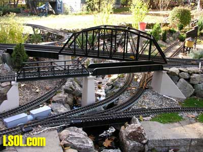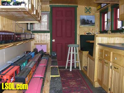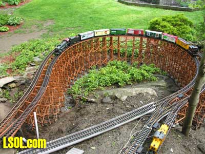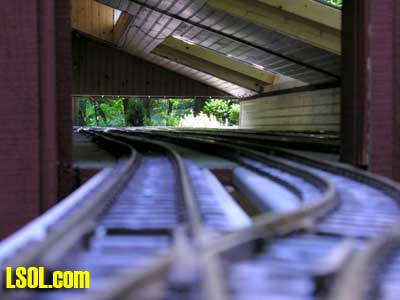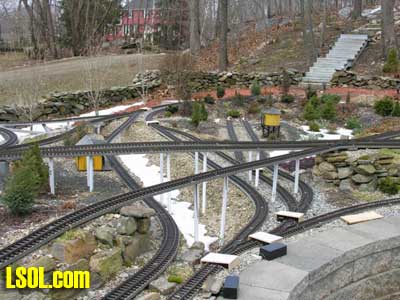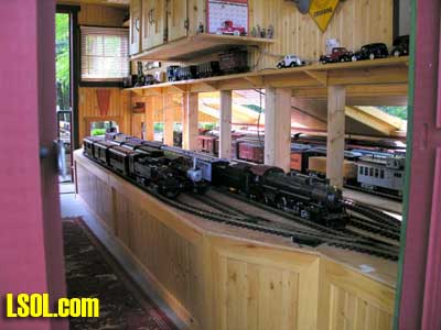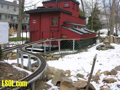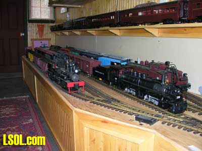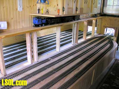 In a previous LSOL online article, I described the construction of a full-size bobber caboose built to store and dispatch my garden trains (A Bobber Caboose Replica as a Train Storage/Operations Center ) Even as construction progressed, my inventory of motive power and rolling stock grew. It soon became obvious I was rapidly running out of storage tracks. This update describes the construction of the addition to the caboose I alluded to in that article. The caboose itself and a photo providing perspective on the main layout are shown. Trains, stored on sidings within the caboose, exit and traverse an elevated connection (made with PVC conduit supports and Trex(tm) decking) to the raised layout. From there they can travel through varied routes on the main section and, when desired, return to the caboose. Returning trains continue through the caboose exiting the opposite end (left side in photo) to an elevated turnaround before reentering on a parallel track. For possible solutions to help alleviate the crowded conditions, I consulted with my engineers, Click and Clack and L'il Toot. There was unanimity on the need for "more trains, more trains!!", but the Jr. crew offered little input on budgetary and design considerations. To achieve my goal of providing added storage without having an adverse effect on the aesthetics of the caboose itself, we agreed to bump out the rear wall with a lean-to addition. This would be slightly offset to the length of the structure so, at least from the front, this would give the allusion of a building behind the caboose. I drew up plans and constructed the addition in a modular fashion over the winter months in my heated workshop. In the spring I began the "Surgery" on the caboose at the first bit of warm (i.e., not-so-cold) weather. The back of the caboose faced the woods and so I left it undecorated except for the paint. My first task was to remove the T1-11 siding at the level of the inside tracks. Next, I covered the two 4' x 8' platform modules with plywood on the top and insulated them underneath. I attached them to the side of the caboose with supports, consisting of 4" x 4" posts anchored to prefab concrete piers and a beam. These were used to bear the weight of the addition. Next, I framed and insulated the sidewalls and attached gable ends to the platform. I covered the inside surfaces of these modules with the same T&G pine paneling used for the caboose interior and finished them with stain and a polyacrylic topcoat. The second photo illustrates this more clearly. The structure in the middle of the platform is a garage door style opening mechanism that I didn't use in the final version. I made this door with hinged sections of T&G fir flooring. However it tended to "rack" on the homemade tracking/pulley mechanism. Perhaps this would have worked with a little fiddling (or for a shorter length door), but I opted for the out- swinging door shown later on the completed addition. I used a lift- up mechanism assisted by a pulley and spring on the smaller door at the other end of the extension. I added the roof sections, each with a large, piano-hinged access door framed in and covered with plywood. I made a second cut in the caboose sheathing to accommodate the cupola for the shed addition. Serendipity prevailed for my window selection. While visiting my son's house I spied two unused exterior door sidelight panels that had been left over after being replaced by more decorative glass versions. These were heavy, double -insulated glass and I simply milled pieces of 2" x 2" and attached them to the existing frame. I attached the windows and the frames and covered them with sheathing. I reused the T1-11 cut from the caboose on the exterior walls of the addition. I then covered the entire roof structure with felt cloth as a temporary measure awaiting the application of flashings and the same roll rubber roofing I used for the caboose. I did make divided light insets to break up the expanses of glass, but I wasn't quite satisfied with the spacing, so these will be redone. I installed the rubber roofing and added the PVC lattice as a skirt below the addition. With the exterior now weather-tight, I turned my attention to the interior. My first task was to remove the drywall that had been left intact between the caboose and the addition. With this and the cleanup accomplished, it was now time for me to begin laying track. I first installed the yard tree switches outdoors at the turn-around end over a cellular PVC roadbed made from Tuff-Board(tm) available from Home Depot I then laid track in the extension using LGB 3- meter rail lengths and ties. I installed switches in the mainline at the caboose entrance to allow two of the additional sidings to serve as both arrival and departure tracks. The third picture of a front-to-back view through the addition illustrates this. As the final step of the caboose project was for me to replace the PVC conduit circle, which had merely rested on top of the ledge below (my Rock Ridge Rd. address is aptly named!). This replacement requirement led me to my second project of the winter that was to build a wooden trestle in my shop. A double version of the trestle appeared to add interest and versatility without much additional work. I cut stripwood from 4" x 8' or 12" clear cedar. This material was the leftover ends from a massive cedar pergola a friend had installed at her house. Many sticks and bags of sawdust later, I assembled the trestle bents using Garden Texture templates. They were interconnected on a jig to facilitate spacing. I first assembled them in banks of 7 bents and joined two banks outdoors and braced them for stability in transit. I used strips of 1/2"x3/4" Tuff-Board(tm) paint- matched to the cedar stain for the top trestle stringers. These stringers were quite flexible and this approach avoided the laborious task of laminating very thin strips of wood and bending the stringers on a jig. I was greatly relieved