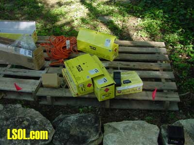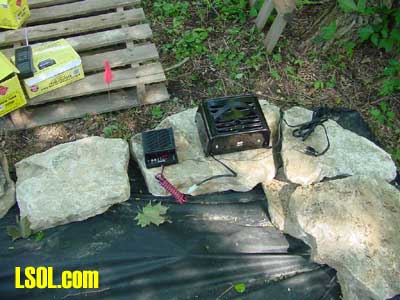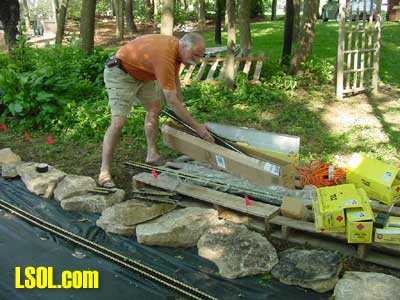 Noting his new interest in Large Scale trains, I thought: Christmas present. The two of us shared the same early childhood, Christmas morning memory of a new train set. So I ordered David a Bachmann White Pass & Yukon Ten-Wheeler and four Bachmann White Pass & Yukon Jackson Sharp passenger cars. I also purchased an ARISTO/Crest 10 amp Ultima power supply, an ARISTO/Crest Train engineer and a circle of ARISTO brass track and sent them to him. Needless to say, David was incredulous when he opened the presents. Calling from Indiana, he profusely thanked me and asked, "When can you come to my house to help me set this up in the backyard?" We agreed to work in the three days before the start of the U.S. Grand Prix activities scheduled at Indianapolis. The Motor Speedway is near his home in Noblesville, Indiana. I was already booked for our traditional race gathering with my son David, from Virginia, and his buddies. (I join son David for his racing hobby and he goes with me to York for the TCA meets.) To make my assistance most productive, I told brother David that he should clear the area for the railroad, construct a frame or border for the railroad and put down the black plastic weed control sheets within the area for the railroad. I sent him a couple of books on Large Scale railroad construction and asked him to design his track plan. We had several conversations over the next few months about what he wanted in his railroad. His desire for a Large Scale railroad fit into his overriding interest in all things cowboy. He explained that he would like a railroad set in the old West, and it would carry passengers between old western towns and would transport horses and cows to market. He said that he was primarily interested in sitting and watching the trains run rather than doing much switching. After much discussion, he decided on a dog bone main line with a passing siding or two. About a week before I arrived, David cleared the area for the railroad, purchased and placed small limestone boulders as a border around the railroad area, and spread the black plastic within the border. He located a source for the crusher fine rock that we would use for the roadbed for the railroad. When I arrived, all was in readiness for us to be productive.