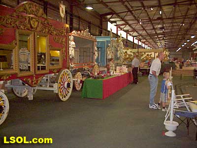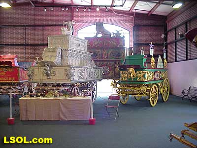 Tom also spends a considerable amount of time at the Circus World Museum. The Circus World Museum in Baraboo, WI is a living museum. It is on the banks of the Baraboo River where the Barnum & Bailey Circus wintered in the late 1800's and early 1900's. The museum has several shows daily and has displays of circuses gone by around the grounds. There are nearly 200 circus wagons, most of which have been completely restored. Finally, there is an amazing resource library, which can be accessed by the public. Historic displays and warehouses full of memorabilia and costumes can be seen. There is a huge rail storage barn on the property. First built in the 1800's, enlarged it can hold 18 circus flat cars on three tracks. It is the largest and last all wood rail barn still standing. This barn is currently undergoing the first of several planned renovations. The Museum owns dozens of rail cars used by circuses for travel. The Museum has even transported equipment and wagons for parades on its own rail equipment. Tom took most of following museum pictures last year early in the morning before visitors arrived. Note several of the restored circus wagons in a view along the south side of last year???s layout towards the west end of the wagon barn.