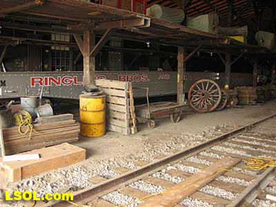 One of the long circus flat cars is stored inside, but will soon be added to the collection in the refurbished car barn.