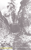 CRNW rotary snowplow going through 50-foot trench | The Kennecott Mines started with the Bonanza, then the Jumbo and finally the Mother Lode. Two smaller mines--the Erie and Glacier were developed as well. All of these sent ore to the 14-story Kennecott mill by means to two aerial trams of about 3 miles each that connected the back of the mill to the Bonanza and the Jumbo Mines--nearly 4,000 feet in elevation above Kennecott. |