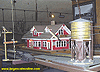 The hospital, engineers' staff house, and mill building models | All of these buildings are 1/4 inch plywood construction with 1/8 inch plex for windows. I placed the interior floors and walls in all the buildings and wired them for lighting using salvaged 6-volt pinball light holders and transformers. This feature is a throw-back from the days when I owned a coin-operated amusement company. The system works remarkably well. |