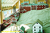 McCarthy railroad yard model | I had built up a large collection of framed historic photos of Kennecott and its CRNW Railway, including many interesting historic panoramics, which I hung in the bar. I began building overhead supports for indoor track in 1998. In 1999 the model railroad finally ran for the first time. Some of the model rolling stock was now four years old. |