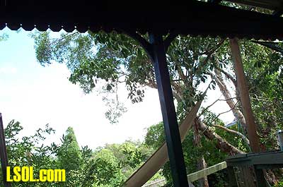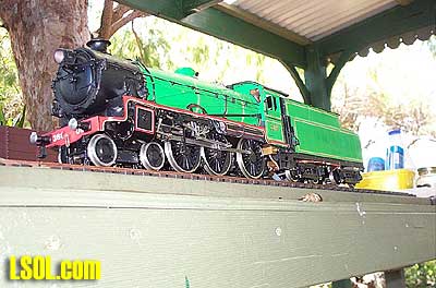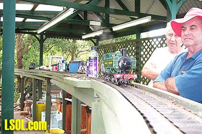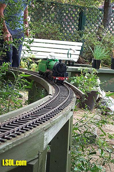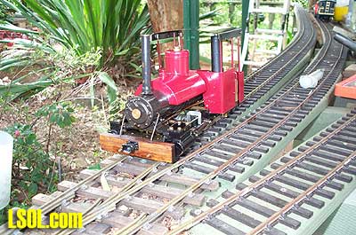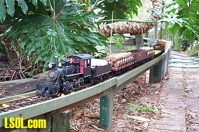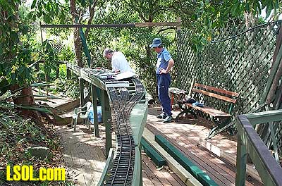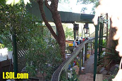 That was last September and now things are looking very different indeed. Stuart's land slopes away from the house to about 6 feet at the fence line so an elevated track was the only way to go. He had a walkway constructed from treated pine around the outside with the track itself supported on treated pine posts cemented into the ground. The road base is exterior plywood with Peco flextrack on top. There is a lift out section to allow access to the BBQ area  but we are working on him to build a bridge, after all every railway needs at least one bridge. I built an extra turnout in the steaming yard and have two more to go. I will do another article later on building turnouts in situ. It is very easy to do. The roster at present is mainly just locomotives, except for the odd bit of Bachmann rolling stock. The type of locomotives is quite varied with everything from Mamods to Aster Garretts, A3 Flying Scotsman and Pannier tank  to an Argyle Bantam  A 36 class New South Wales Government Railways locomotive  and soon a few Edwins, when I finish building them. On the other side of the fence we also have a Bachmann Shay and a Bachmann 2-6-0  that have been converted to battery and radio control. This layout serves the purpose of giving us the opportunity to run in a very nice bush atmosphere.   Stuart's original idea of having this set-up in his back yard has really paid off with the way that I it just blends in with its surroundings. Stuart said that the layout might be on his land but it belongs to everyone.  This attitude is great as I know that by the time that I get mine finished I won't consider it mine alone, but a something and a hobby to share with my friends. Long Live Garden Rail. Top of Page