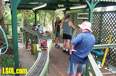 Dunwerken  As this is my first article I really should make a few things clear. I am a member of a social group of five persons that are infected with the Garden Rail bug. My official title within this group is D4. The group has drifted together by word of mouth and friendships within another section of rail modeling. The garden layout I am talking about is called 'DUNWERKEN'  mainly for the reason that four of the five are retired and we thought we were Dunwerken. How wrong we were. The group was christened the DOGS (Dunwerken Operation Group - sometimes) with the owner of the land that the layout is built on being D1 and down the line to me. A friend thought that the name meant -'Doddering Old Gents Society" but I think we prefer the other name. Anyway back to the layout. Stuart (D1) built this circle of track in his back yard quite some time ago and dabbled with the odd live steam locomotive on it.   It was a little uneven and a few of the turns were a little tight for his locomotives. He then spoke to Laurie (D2) about coming over to have a look. Laurie in turn introduced Mark (D3). This meant that Stuart now had two people that decided that everything that was done had to be perfect, so Mark brought along a dumpy level to check the track and the rebuild began. This re-levelling took quite a bit of time and luckily I was not involved at this time. My first visit was the day that the Garden Rail Virus bit me very hard. My wife has had a different view this time about railway modelling because she can see in her minds eye our back yard being FINISHED. Stuart was given a set of three way points (sorry turnouts)  and this has led to more framework and sidings being constructed and then the suggestion of a station building to cover this new steaming area. This building was not to be an ordinary shed, but a scaled down copy of the buildings on the New South Wales Rail network. (Australia)