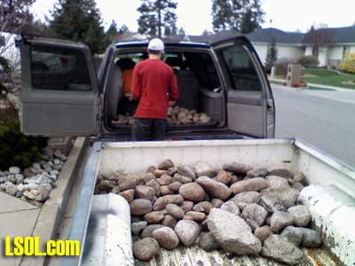 Working on the Chain Gang One other thing we do is go and find rocks for our railroad. Rocks are the other big crop in North Idaho, second only to potaotes. We find the local farmers are more than happy to give them to us for free. They kind of look at us a little funny as we load up the back of our SUV and our little trailer - trip after trip. Best part is Bryan is now almost 16 years old and can lift that barge and toat that bail with the best of them.