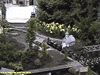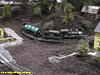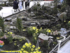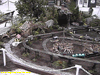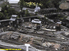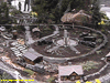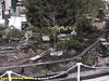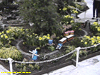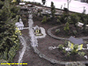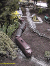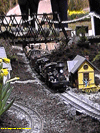 Click for larger picture  Click for larger picture  Click for larger picture  Click for larger picture  Click for larger picture | Our garden railway club, the Susquehanna Valley Garden Railway Society based in central Pennsylvania, has grown about ten fold since the club's inception in 1995 to nearly 100 members. One of our most popular activities are the public displays we set up throughout the year. We have been setting up an annual Christmas display at a local park for the past 6 years, a garden display at the York Flower show for the past 4 years, a display at the PA railroad museum for the past two years and a floor display at the ECLSTS for the past three years. Recently we were approached by the sponsors of the first annual Pennsylvania Garden Expo in Harrisburg, PA to build a display for their show in March. We agreed to build a large display for the four-day show that ran from March 13th to March 16th and it turned out to be the largest display we have built to date. The display was about 700 sq. feet in size with hundreds of live plants, and four trains running at once. Nine club members started construction around 9:00 am on March 12th. Lou Stahl, Joe Mower, Mike Oberdick and Randy Mower started laying track while Brian Fleeger and Lisa Boll started on the pond; Turk Russell and Jeff Shubert started building a mountain and tunnel by the waterfall area; and landscape designer Mel Shubert and Tom McCloud of Appalachian Nurseries started the landscaping. We had the track down by 1:00 pm; then we started working at shoveling yards and yards of bark. By 5:00 pm, we were putting down the buildings; and by 7:00 pm, we were done with the details and the finishing touches. |