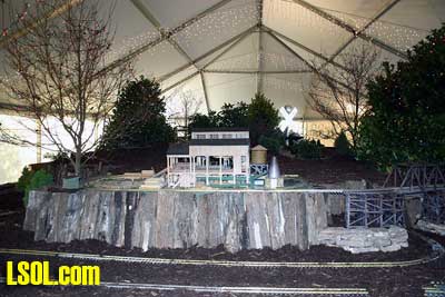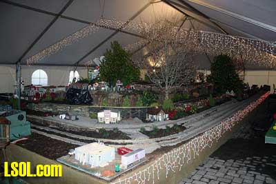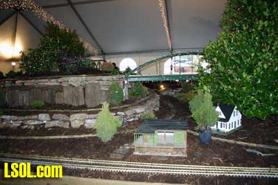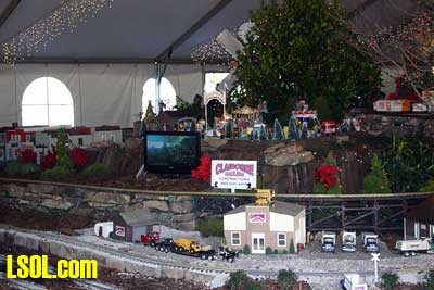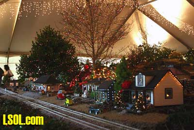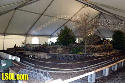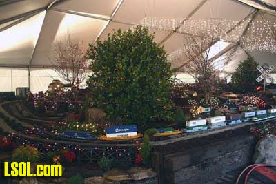 Now in 2009, the display is bigger and better. A crew of 11 took a total of 13 full days to set up the display. Two large waterfalls, arching fountains, and 1000?s of lights greet the visitors as they enter the tent. Of course trains going in several directions adds to the impact of the entryway. One trip around the display cannot possibly begin to allow a visitor to grasp the entire setup. Several trips around the entire display are a necessity, and even at that, some of the younger visitors are heard kicking and screaming as they are dragged out of the door.         Buildings made with the greatest of detail. An animated sawmill. Several bridges and trestles, some over the water features. An animated carnival. These are just a few of the setting items found in the display.         All eras of the US train history are represented in the engines and rolling stock. Complimented with the scenery along each track, the trains represent everything from the logging industry of the past up to the long container trains of today. From geared engines, lugging log trains in the "hills" on the display to ABA diesel trains pulling a 20 car circus train over the longer stretches of track. Even fanciful Fortuna Flyers and Eggliners are seen buzzing around occasionally. The list of things to see is almost endless.       Hard work? ABSOLUTLY Worth it? ABSOLUTLY It is a labor of love. It is for the kids. From 1 to 93.