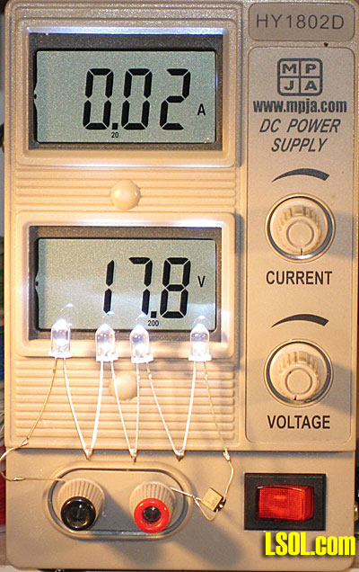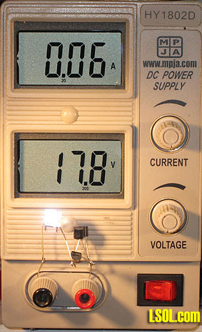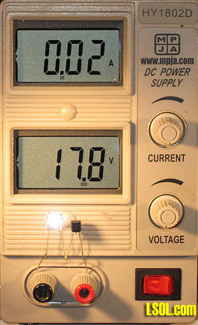 Introduction A few years ago I wrote an article, A Simple Constant Brightness LED, that described a circuit that could be used to illuminate an LED to full brightness over a range of voltages. Since then technology has continued to advance. I recently came upon a new solid state device that takes much of the guess work and computation out of the equation when we use LEDs. This new electronic component is designed specifically to drive LEDs. Before we delve into its characteristics and use it might be wise to review how LEDs operate and the "rules" one must follow to keep burning brightly for many, many years. The Rules 1. LEDs require a minimum voltage to create light. This voltage can vary with LED color and generally ranges from 2 - 3 volts. This is called the LED's "forward voltage". Note that this is a minimum. Higher voltages can be used so long as one adheres to rule #2. 2. LEDs are current driven devices. Once the minimum forward voltage is delivered (Rule #1) the LED will light. Its brightness will be determined by that voltage and the amount of current that it is allowed to consume. The higher the current delivered the brighter the light... up to a point. If too much current is allowed to flow the LED will quickly heat up and be destroyed. Most general purpose LEDs operate well at 20 ma, 0.02 amps. That is a very small amount of current and explains why LEDs deplete batteries so slowly. 3. LEDs operate from direct current, DC, and have two leads, a cathode and an anode. The cathode connects to the negative power connection and the anode to the positive. The anode is generally the longer lead. The cathode frequently extends from the notched side of the LED and is shorter.  If you follow these rules you should get good service from your LED lighted equipment. Stray from them and you are likely to see how quickly an LED can be destroyed! Limiting Current The most common way to limit the current that is allowed to flow through an LED is to place a resistor in series with the LED and its power source. A number of methods of determining the value of this resistor are explored in the LED article referenced above. Typical values range from 100 ohms to 1000 ohms depending on the LED and the voltage that is being used. This is one of the problems with limiting current with resistors, the higher the voltage the higher the resistance must be. This photo shows a very simple LED circuit composed of an LED, a 470 ohm resistor and a common 9 volt battery. Note that the resistor is connected to the positive terminal on the battery and to the anode on the LED. Even though it makes no difference which lead of the LED you connect to the resistor I have gotten into the habit of always putting the resistor on the anode side of the LED. That way I can tell at a glance which lead goes to positive and which goes to negative.  A Better Solution LEDs have become so common in our homes, consumer electronics and automobiles that it is not surprising that an integrated circuit has been developed that is aimed specifically at driving LEDs. This device is the CL2N3-G LED Driver from Supertex. It is inexpensive, even in small quantities, and is configured to deliver a constant current of 20 ma to an LED. The CL2N3-G can be ordered from Mouser Electronics for about $0.44. There is also a similar IC that delivers 25 ma, the CL25N3-G. The CL2N3 couldn't be easier to use. Just insert it in series with the DC power source and the LED. The TO-92 package has three pins but only the outside two are used. The center pin can be cut off. The positive voltage goes to pin VA and pin VB goes to the anode of the LED. Remember, the center pin, labeled NC, is not connected.  CIRCUITS The simplest circuit utilizing the CL2N3 is shown below. The amazing thing about this device is that the battery, or other DC power source, can be as high as 90 volts and the LED will still see only 20 ma.  Here is a photo of the same circuit. Notice that the center lead of the LED driver has been cut off.  LEDs in Series You may recall from one of my earlier articles on LEDs that they can be wired in series (see: LEDs 101 - The Basics). The beauty of using LEDs in series with the CL2N3 is that you do not need a current limiting resistor. All of the LEDs in the series will get 20 ma and all will light so long as the voltage supplied is high enough to deliver the required forward voltage to each LED. For example, if each LED requires 2.2 volts to light and you are putting six of these LEDs in series the voltage must be at least 6 x 2.2 or 13.2 volts. Any voltage at or above 13.2 will work. If your batteries supply 20 volts you could have as many as 9 of these LEDs in series. What a great way to illuminate the interior of a passenger car. Here you can see four LEDs wired in series along with a single CL2N3. The circuit is powered by a bench power supply that is supplying 17.8 volts, shown on the bottom display. The top display shows that the circuit is drawing 0.02 amps or 20 ma, just as we would expect.  CL2N3s in Parallel The CL2N3s can be wired in parallel should you want to supply more than 20 ma to your LED. This might be done if you were working with higher output LEDs like those that I used for the head lights for Mr. Rogers Trolley. Each of those extremely bright LEDs drew 60 ma. To safely drive them this circuit could be used:  The next three photos show a 1/2 watt LED connected to 17.8 volts. The first photo shows this circuit with a single CL2N3. The meter tells us that 0.02 amps is being supplied to the LED.  Here a second CL2N3 has been added to the circuit. It is wired in parallel with the first LED driver. The meter shows that 0.04 amps is being supplied as we would expect. Although it is difficult to see in the photo the LED is also considerably brighter.  The last photo in this series shows three CL2N3's in parallel and 0.06 amps going to the LED allowing it to achieve its full brightness.  Conclusion I think you will agree that the 