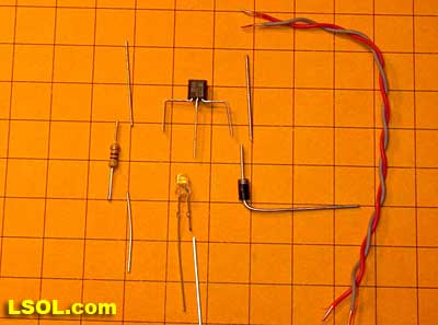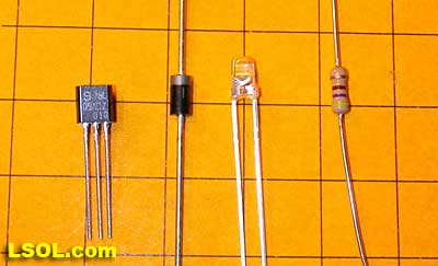 Here are the components needed. From left to right they are 78L05, 1N4004 diode, LED and 470 ohm resistor.