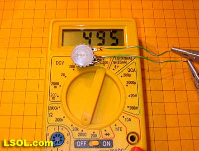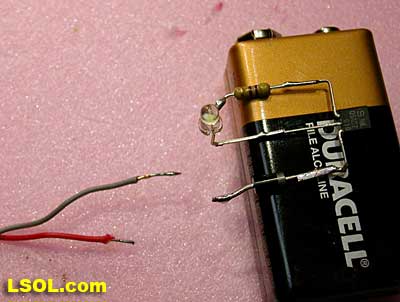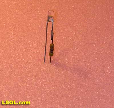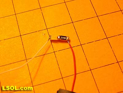 Note that the resistor being used below is marked "510" - this is a 51 ohm resistor. (Take the first two digits, 51 in this case, and multiply them times 10 to the power of the third digit, 10 to the zero power in this case, which is 1 - a resistor marked 513 would be 51,000 ohms as 10 to the third power is 1000. 51 x 1000 = 51,000)
