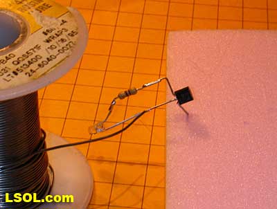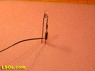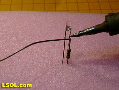 Soldering Push the leads of the resistor and LED into a piece of foam to that they are held in proper orientation during soldering. Note that the resistor and LED lead are not quite touching. This was done so that the individual parts would show up in the photo. Before soldering make sure that they touch evenly.