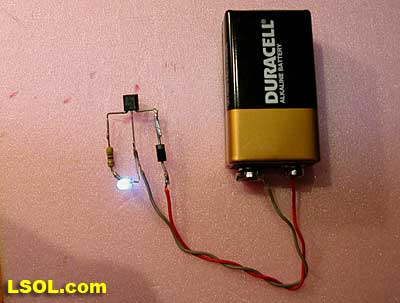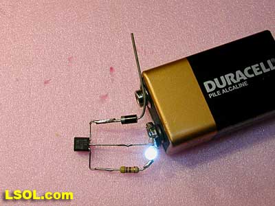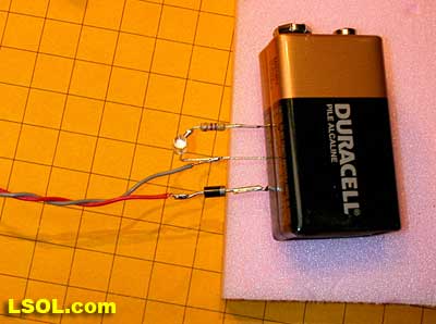 The circuit is just about complete and can be tested. Carefully touch the center lead of the regulator to the negative terminal on the battery. Touch the positive end of the diode to the positive terminal. The LED should light!